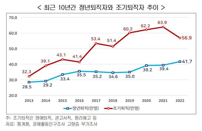 한국은 2013년 고령자고용법 개정을 통해 2016년부터 기업의 법정 정년을 만 60세 이상으로 의무화하였습니다 . 이로써 이전까지 관행적으로 많았던 55세 전후의 조기퇴직 관행에 변화가 생겼고, 많은 대기업들이 정년 연장에 대비해 임금피크제 등을 도입하기 시작했습니다 (실제로 2016년 당시 조사에서 대상 기업의 42.7%만 임금피크제를 도입한 것으로 나타났습니다). 다만 중소기업 등은 애초에 공식 정년제도가 없는 경우가 많아, 정년 연장의 혜택은 주로 대기업 등 안정된 일자리에 집중되는 양상이 있습니다 .