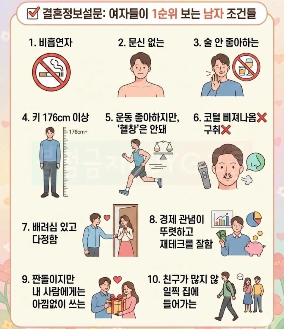 • 건강·위생 관리: 여성들은 남성의 자기관리를 매우 중요시한다. 비흡연·절주·적절한 운동 등을 통합해 자기관리 성향을 평가한다  . 예를 들어, 코털·구취까지도 기본 위생의 척도로 보아 “어떤 사람이든 좋아보이기 힘들다”고 판단한다 .