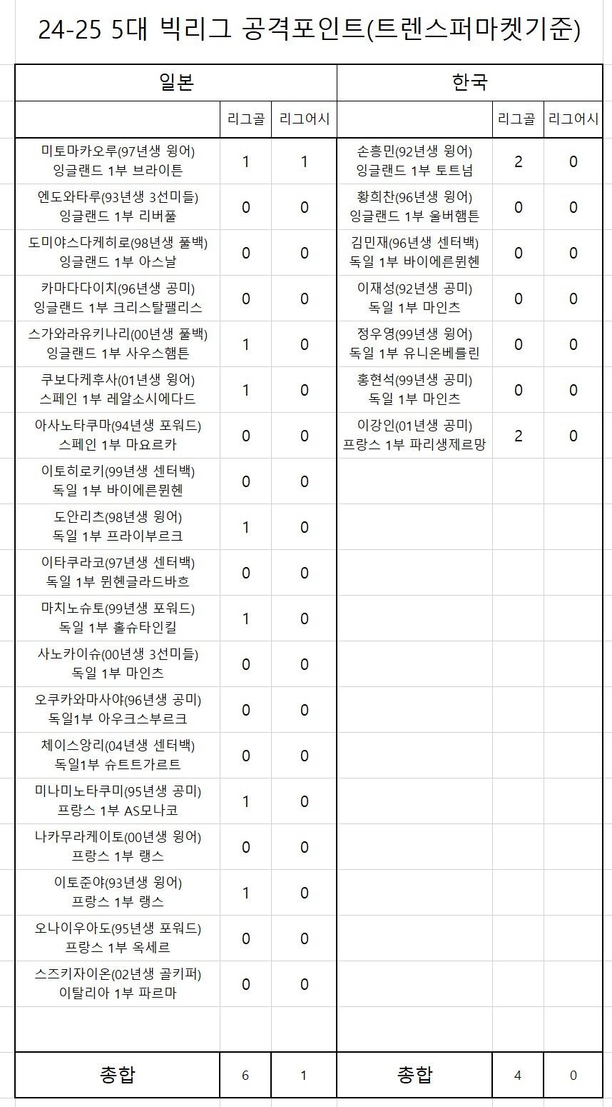 24-25 시즌 5대 빅리그 공격 포인트 (트렌스퍼마켓 기준)
