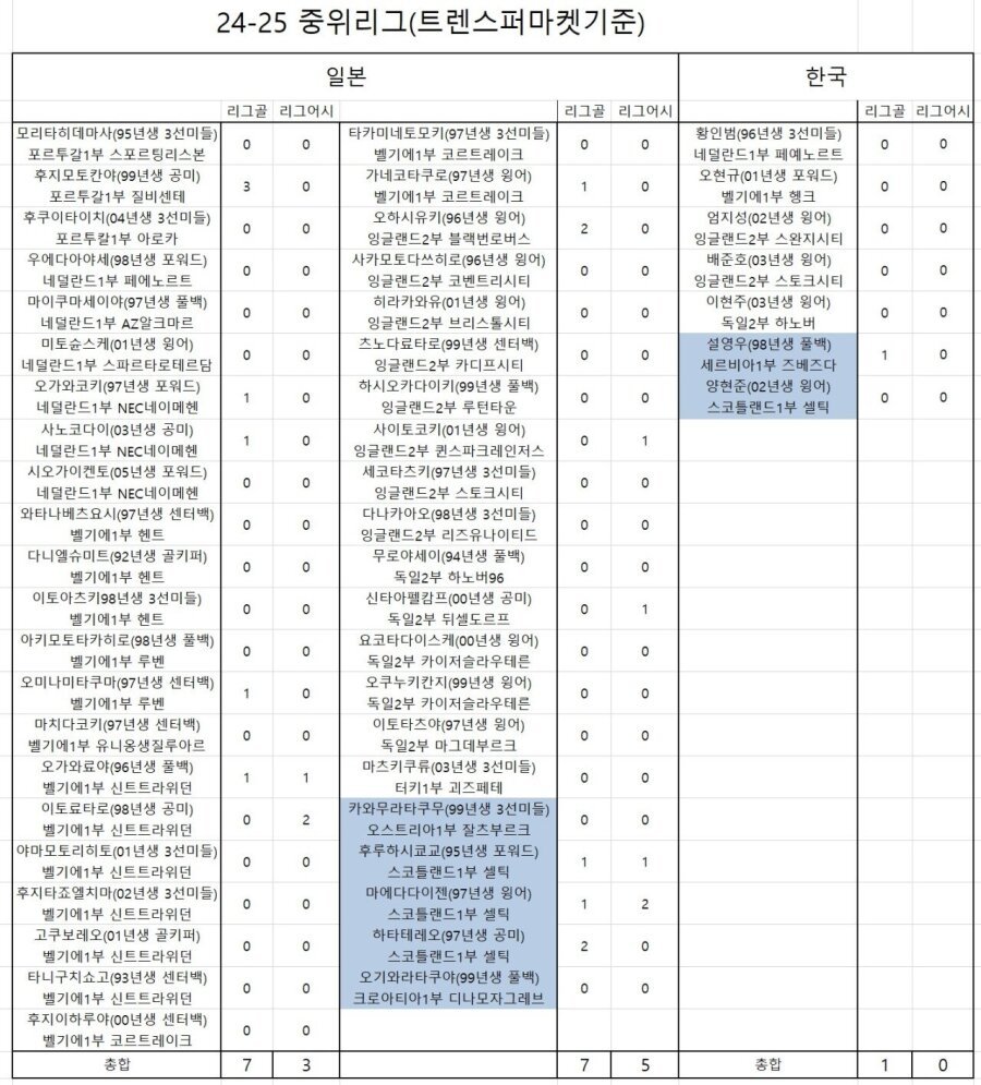일본은 유럽 주요 리그와 중위권 리그에 걸쳐 다수의 선수를 보유하고 있으며, 특히 공격 자원에서 많은 선수가 활약하고 있습니다. 이는 선수층의 폭이 넓고, 다양한 리그 경험을 가진 선수들이 많다는 것을 의미합니다. 한국은 비교적 적은 선수들이 유럽 리그에서 뛰고 있으며, 그중에서도 빅리그 중심의 선수가 많습니다.
