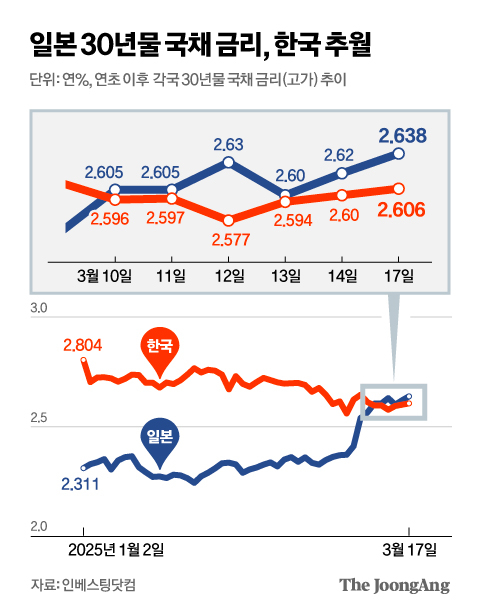 최근 일본 30년물 국채 금리가 17일 장중 연 2.638%까지 상승하면서 한국 30년물 국채 금리(고점 연 2.606%)를 역전한 것은 2016년 8월 이후 처음 있는 현상입니다.