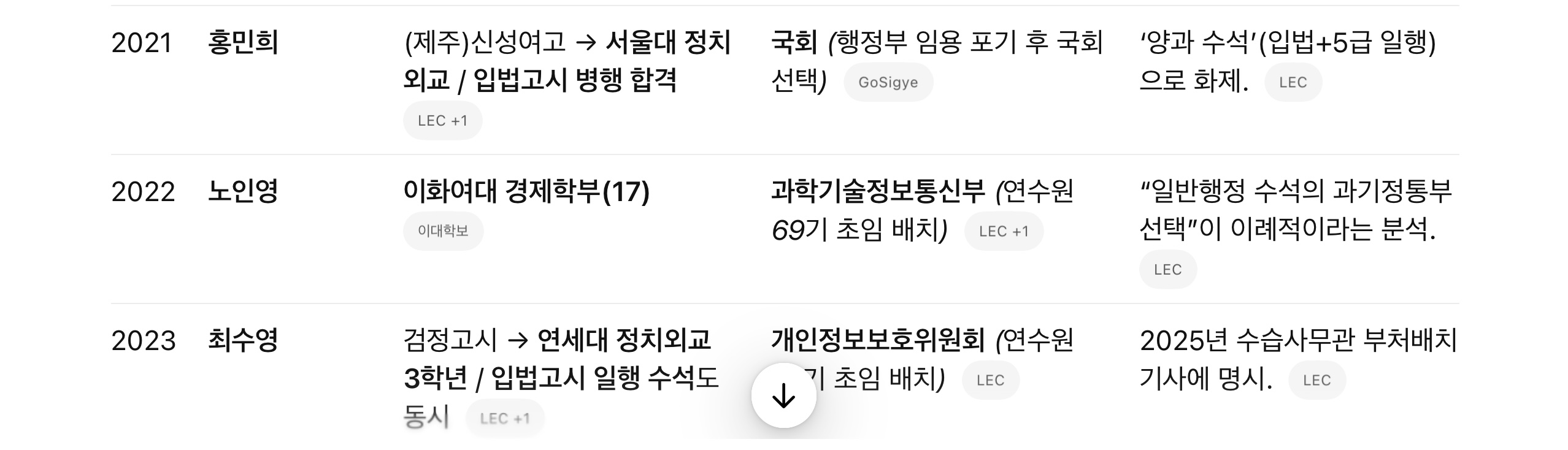 • 국회 선택 사례: 2021년 수석 홍민희는 행정부 임용을 포기하고 국회로 진로를 택했습니다(드문 케이스).