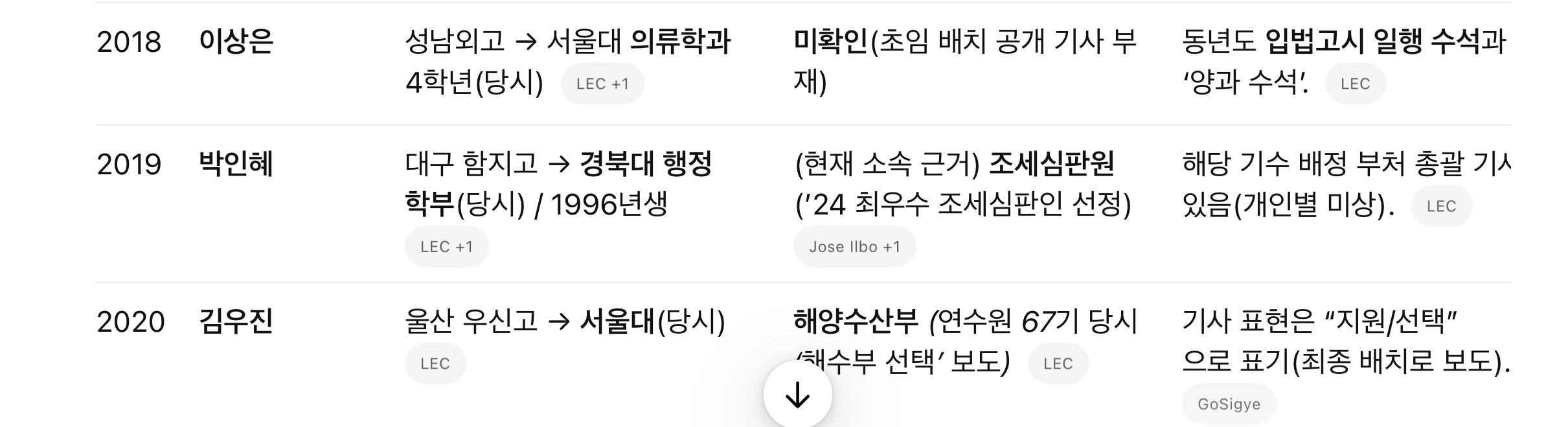 • 현재 소속 근거: 초임이 공개되지 않았으나, 최근 기사로 현 근무기관이 명확한 경우 보완 메모를 덧붙였습니다(예: 2019 박인혜→조세심판원 수상 보도).