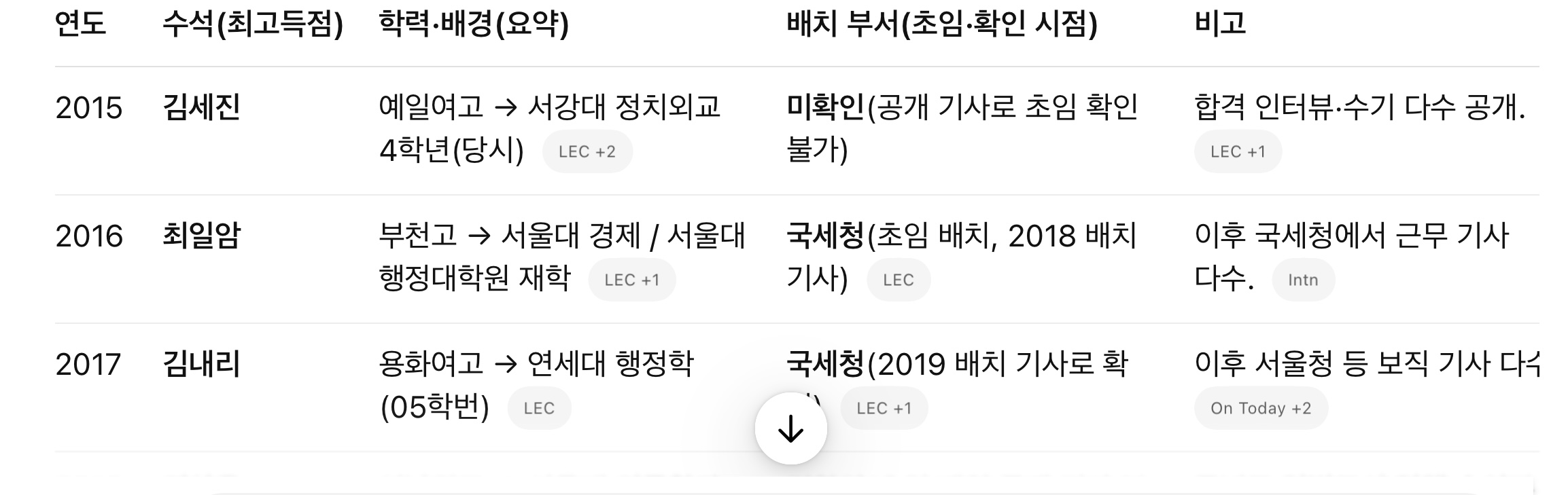 • 국세청 강세(과거): 2016·2017년 일행 수석의 초임이 모두 국세청으로 확인됩니다.