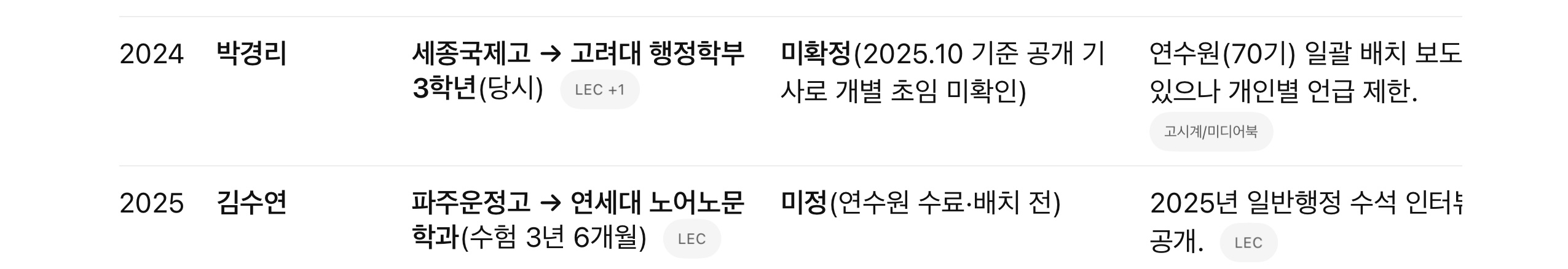 • 메모: 동기 전체 배치에 관한 보도는 있으나, 개인 실명이 연결된 초임 정보는 제한적입니다.