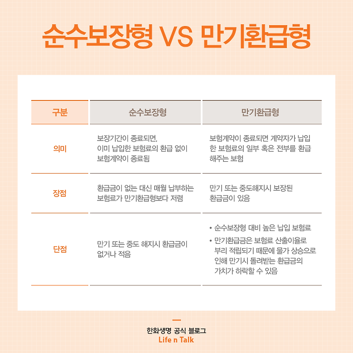 한화생명e정기보험 (무배당)  정기보험 (사망보험) – 가입금액 1천만원~5억원 보장, 인터넷 전용 상품 선택형: 만기환급형 또는 순수보장형 선택 가능• 만기환급형 선택 시 만기 시 납입보험료 전액 환급• 순수보장형 선택 시 해지환급금 없음으로 보험료 할인  (보험료 약 20~40% 저렴) 납입: 일정납입 (예: 전기납)보험기간: 5년, 20년 또는 60세·70세·80세·100세만기 등 선택  (만기 시 환급 또는 소멸)