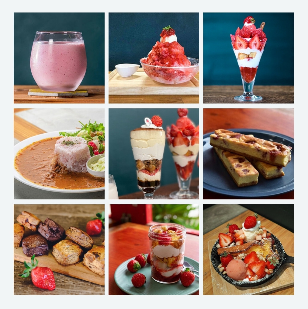 糸島磯本農園の朝採れあまおういちごを使用した「タンナルあまおうパフェ」はじめ、お土産にも人気のオリジナルあまおうコンポートや飲むあまおう酢などを使ったいちごづくしのメニュ