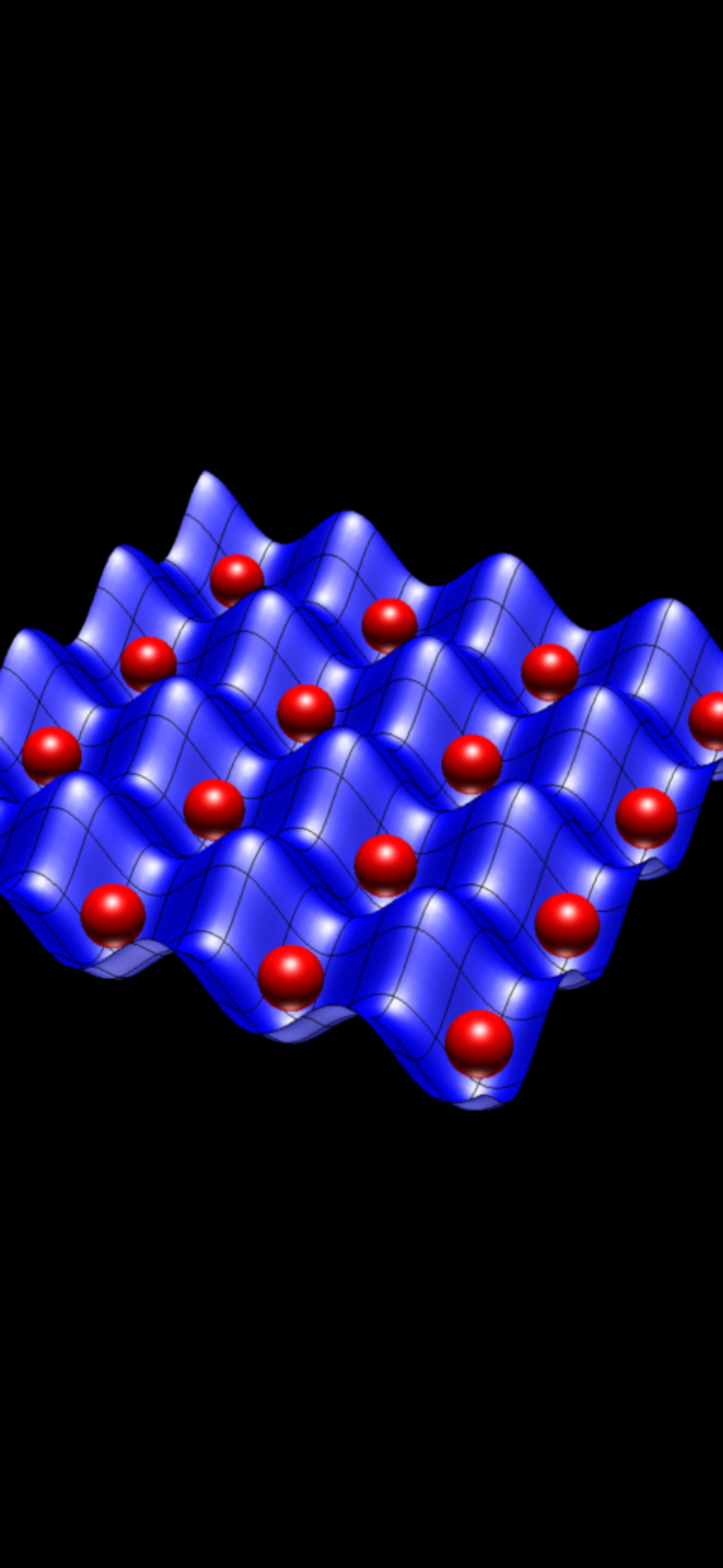 광격자시계의 개념적 그림: 레이저 간섭으로 형성된 광학 격자(파란색 곡면)의 우묵한 부분에 중성 원자(붉은 구)를 가두어 배열한 모습. 각 원자는 “빛의 달걀틀” 속에서 움직임이 억제되어, 원자의 진동수를 초정밀 측정할 수 있다.