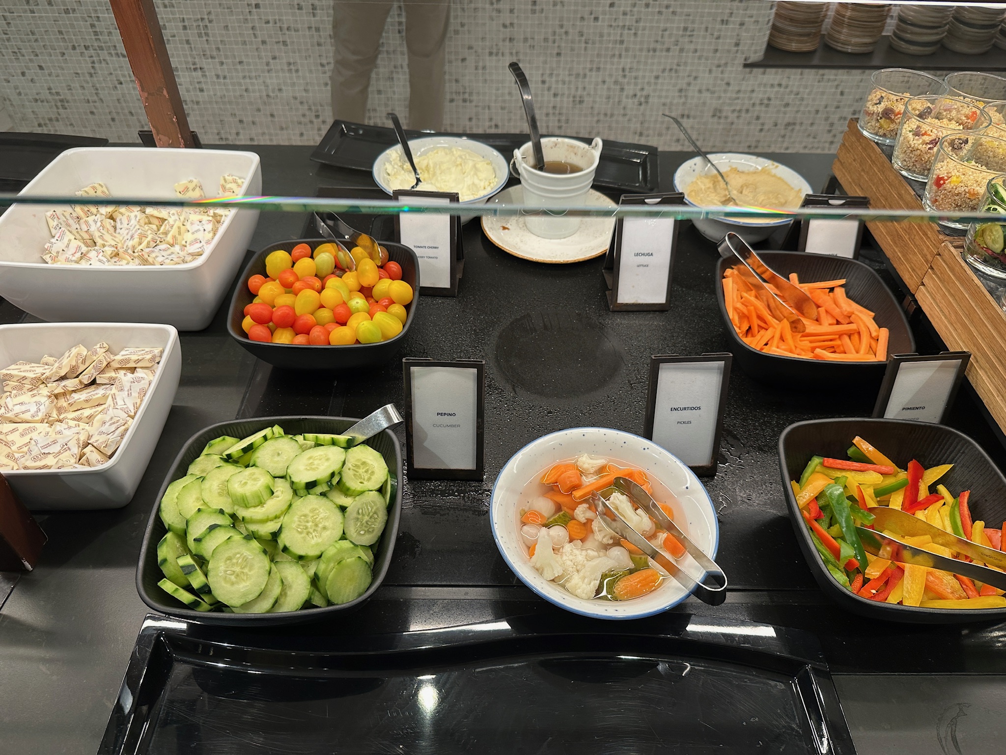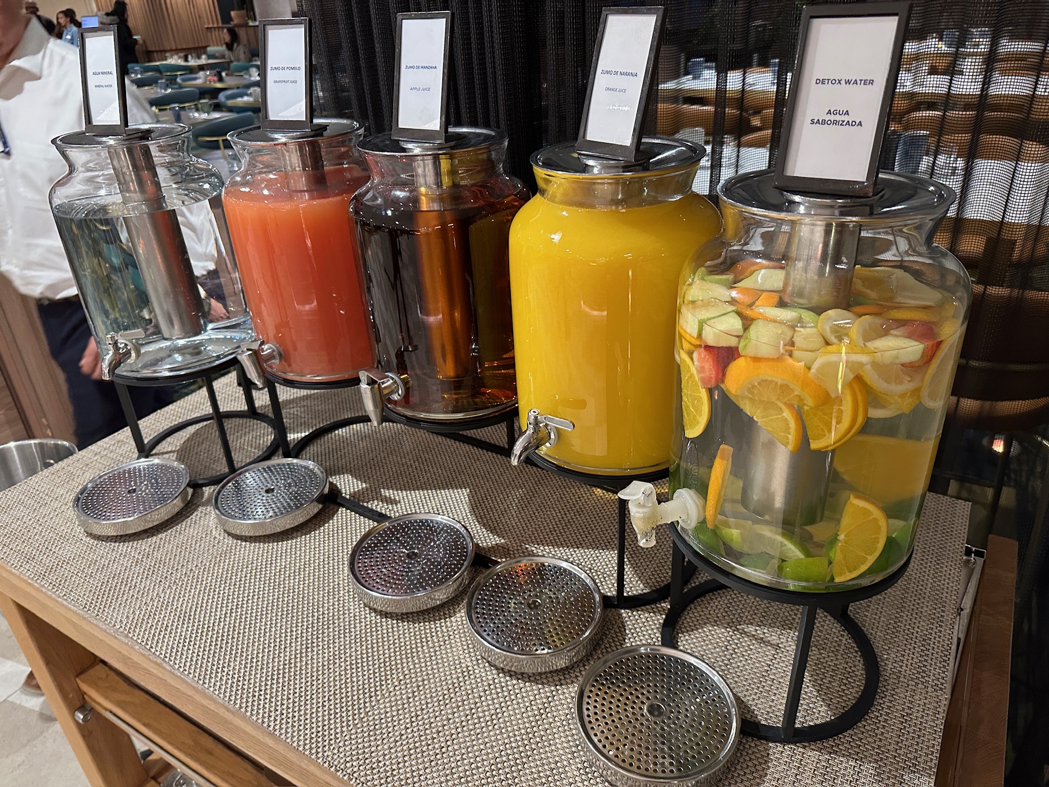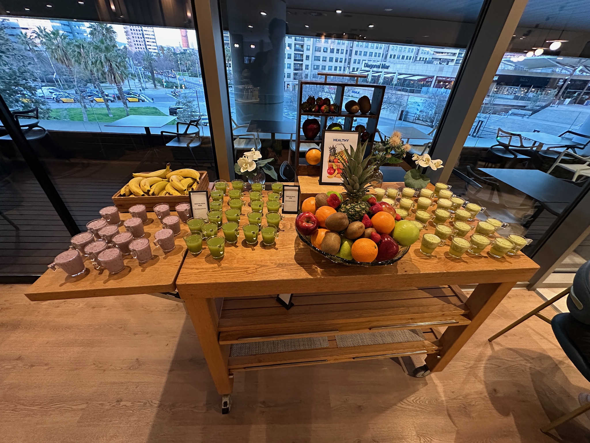 장점: 힐튼 디아고날 마르 바르셀로나 조식의 가장 큰 강점은 풍부한 다양성과 세심한 서비스입니다. 신선한 과일, 페이스트리부터 뜨거운 요리까지 종류가 매우 풍성하고 현지의 하몽, 츄러스 등 스페인 특산 메뉴를 맛볼 수 있다는 점이 매력적입니다  . 셰프가 상주하는 라이브 쿠킹 스테이션에서 오믈렛 등 계란 요리를 즉석에서 만들어 주어 요리 퀄리티가 높고 따뜻하게 즐길 수 있습니다 . 건강을 생각하는 투숙객을 위해 채소, 곡물, 디톡스 주스나 스무디 같은 옵션도 구비되어 있어 균형 잡힌 식사가 가능합니다 . 아이 동반 가족에게는 Kids eat free 정책 및 아이용 식기/메뉴가 제공되어 경제적이고 편리하며  , 아이들이 좋아하는 시리얼 등이 어린이 코너에 준비되어 있어 가족 친화적입니다 . 직원들의 서비스 마인드도 장점으로 꼽히는데, 항상 친절한 미소로 맞아주고 부족한 것이 없는지 챙겨주는 세심함이 돋보입니다 . 음식 알레르기나 특별식이 필요한 경우에도 가능한 범위에서 최선을 다해 맞춤 대응해주는 등 고객 응대 수준이 뛰어나다는 후기가 많습니다 . 레스토랑 내부 공간이 넓고 좌석 수가 충분하여 아침 피크 타임에도 대체로 여유가 있고, 원하는 경우 야외 테라스에서 식사할 수 있어 개방감도 느낄 수 있습니다 . 또한 호텔 투숙객이면 누구나 편하게 이용할 수 있게 뷔페 동선과 테이블 세팅이 잘 구성되어 있어 전반적으로 쾌적하고 만족도 높은 조식 경험을 선사합니다.