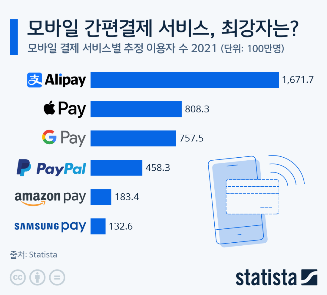 그 뒤로 중국의 알리페이, 미국의 마스터카드, 구글페이, 아멕스(American express), 페이팔, 아마존페이, 한국의 삼성페이 순으로 결제액 규모가 큽니다.