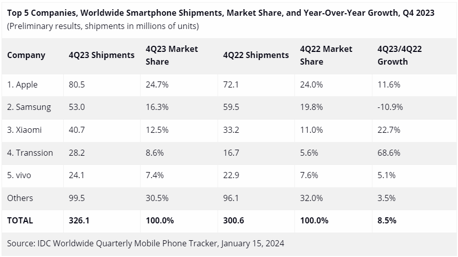 다만, 2023년 4분기 스마트폰 출하량은 3억 2,610만대로 전년 동기 대비 8.5% 증가했습니다. 이는 기존 스마트폰 시장 조사 기관들의 예상치인 7.3%보다 높은 성장률입니다. 중국, 아프리카, 중동 등 신흥 시장의 성장과 프리미엄 제품의 수요 증가에 기인합니다.
