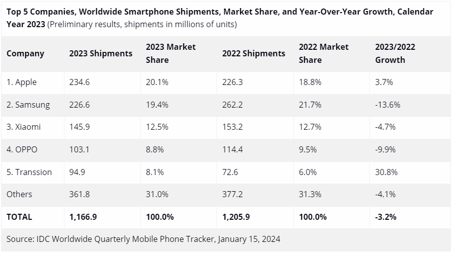 참고로 2023년 4분기 점유율은 애플, 삼성전자, 샤오미, 트랜션, 비보 순서입니다. 3분기까지 삼성전자가 1위로 연간 순위도 여전히 1등을 할 것이라 예상되었으며 실제 한국 언론들의 그러한 예측이 많았으나, 2023년 4분기에는 애플이 점유율을 대폭 늘려 연간 점유율도 1% 차이로 역전한 것으로 보입니다.
