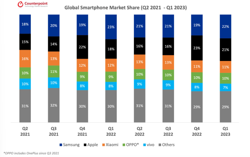 2023년 1분기 전세계의 제조사별 스마트폰 점유율을 요약해서 보여드립니다.