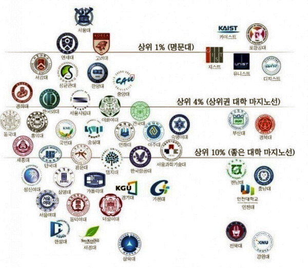 综合1980至2020年代的国内大学排名,可以看出,首尔、延世、高丽、西江、汉阳大学的排名在40多年里几乎保持不变,而成均馆大学、梨花女子大学、韩国外国语大学、아주대(亚洲大学)、단국대(檀国大学)等大学由于企业财团的参与或退出、理工科受欢迎现象、首都圈外迁等因素而有起伏。几十年来,大学排名保持不变的学校被各代人公认为名门大学,这正是入学考试结果累积的成果。