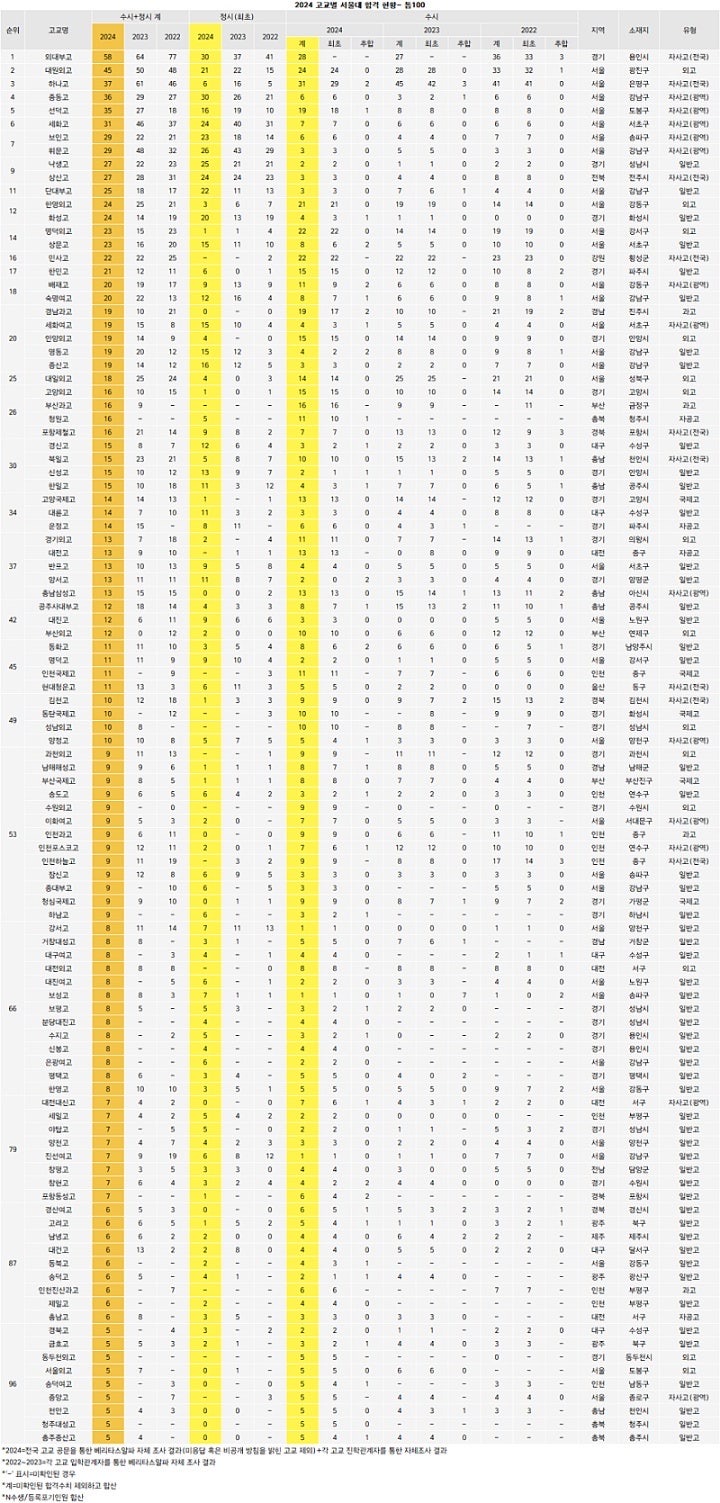 • 하나고: 37명. 학생 선발 및 관리가 엄격한 자사고로, 수시에서 특히 많은 합격자를 배출했습니다.