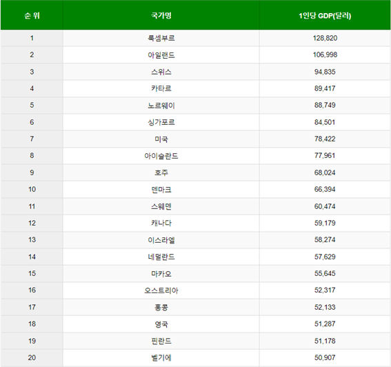 다만 상대적 소국 사이에서 7위와 9위를 차지한 미국과 호주가 눈에 띕니다. 이들은 전체 GDP에서도 각각 1위, 14위를 차지할 정도로 높은 나라인데 1인당 GDP에서조차 상위권에 랭크됩니다. 미국은 현재 세계 패권국이면서 강국이며, 호주는 동남아시아-오세아니아 지역에서 지역 패권을 노릴 정도의 강국으로 성장이 예상되는 국가이면서 상당한 영토 크기를 보유했다는 공통점이 있습니다.