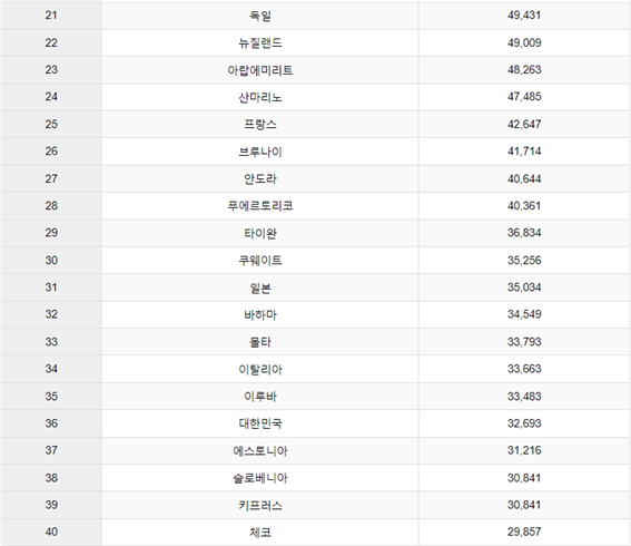 중간권에는 상대적으로 인구가 많고, 자원이 부족하고, 다양한 분야에서 경쟁력을 갖춘 큰 국가들이 많이 보입니다. 예를 들어, 미국, 영국, 독일, 프랑스, 이탈리아, 일본, 대한민국, 대만(타이완) 체코 등이 이에 해당합니다. 이들 국가들은 세계 경제의 주요 선진국으로, 고도의 산업화와 기술력을 바탕으로 안정적인 경제 성과를 보이고 있습니다. 하지만 이들 국가들은 소득 불균형, 노동시장의 불안정성, 환경문제, 코로나19 등의 문제에 직면해 있습니다.