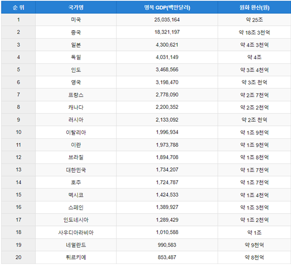 이번 순위에서 특이사항은 11위를 차지한 이란입니다.(미국과 대립하는 그 이란 맞습니다) 다만 미국의 금융 제재를 받고 있는 이란은 경제 실적이 호성적이라기 보다는, 이란 자체의 달러 페깅 정책(고정환율제)을 사용하여 실제 GDP 대비 고평가된 감이 있습니다.(실질 GDP는 세계 30위권이라는 전문가들의 견해가 있습니다.)