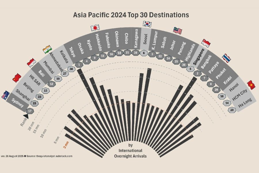 2024년 아시아 태평양 상위 30개 도시 국제 방문객 수 (단위: 백만 명). 방콕이 약 32.4백만 명으로 1위를 차지했으며, 그 뒤를 홍콩, 마카오, 쿠알라룸푸르 등이 잇고 있다  .