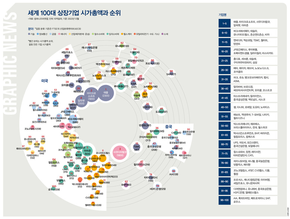 • 놀랍게도 전년 동기 대비 전세계 시가총액 순위에 새롭게 진입한 기업은 없었으며, 시가총액 상위 20개 기업 중 14개가 미국 기업이었습니다. 미국 기업은 세계 경제의 리더로서의 역할을 계속 수행하고 있습니다. 다른 국가의 기업들은 각각의 강점을 활용하여 시장에서 경쟁력을 유지하고 있습니다. 참고로 삼성전자는 2021년 한국에서 9만 전자라는 용어가 나오던 시기의 시총 17위를 달성한 이후 현재까지 전 세계 기업 시가총액 20위 내로 들어오지 못한 모습이며, 계속 중국의 귀주모태주(주류회사), 텐센트(LOL 퍼블리싱으로 유명한 IT기업)와 아시아권 2위 자리를 놓고 업치락 뒤치락하고 있습니다.(현시점 시가총액은 21위)