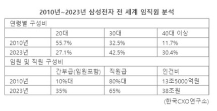 삼성전자의 DS부문은 반도체 사업을 담당하는 핵심 부문으로, 최근 반도체 시장의 글로벌 경쟁이 심화되면서 회사 내부적으로 혁신과 구조조정의 필요성이 대두되었습니다. 특히 삼성전자의 직원 연령대가 급격히 상승하고 있는 문제는 인력 재배치와 신규 채용의 필요성을 높이는 주요 요인으로 작용하고 있습니다. 2010년에는 직원의 11.7%만이 40대 이상이었으나, 2023년에는 그 비율이 30.4%로 크게 증가하며, 고령화가 심화된 상황입니다 .