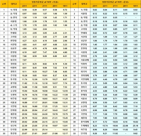 게다가 입결은 대학 지원자 전체의 심사숙고한 선택의 결과이므로 학교 및 학과별 선호도, 전공의 전망 및 적성, 네임밸류, 물리적 입지 등 통학 접근성, 해당 학과의 지원 정도를 고려한 가장 종합적인 지표입니다. (의대 연구논문과 중국인 유학생 수 등 해당 학교 학생 대부분의 역량과 관련 없는 언론 대학평가 순위가 항상 변동적이며, 대학 선택 시 잘 고려되지 않는 이유이기도 합니다)