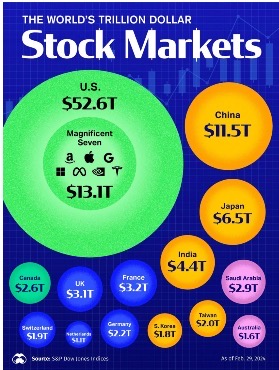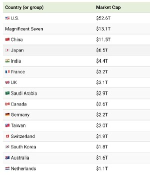 총평: 미국은 세계 경제에서 압도적인 영향력을 유지하고 있습니다. 전체 시가총액의 큰 부분을 차지하는 것은 주로 기술 기업들로, 특히 "매그니피센트 7"이라 불리는 빅테크 기업들이 시장을 주도하고 있습니다. 애플, 마이크로소프트, 알파벳, 아마존, 테슬라 같은 기업들은 글로벌 경제에서 혁신의 중심에 서 있으며, 그들의 시장 가치가 미국 전체 시장의 상당 부분을 차지하고 있습니다.
