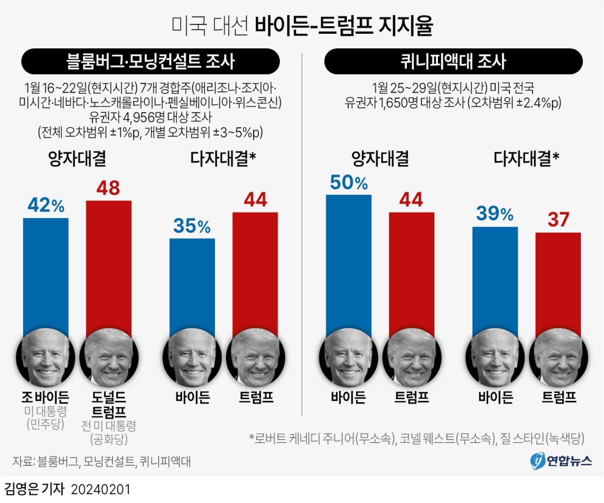 2024년 미국 대통령 선거를 앞두고, 도널드 트럼프 전 대통령의 유죄 평결이 대선 판도에 어떤 영향을 미칠지 많은 이들이 주목하고 있습니다. 지난달 30일(현지시간) 트럼프 전 대통령의 유죄 평결 직후 실시된 여론조사 결과, 조 바이든 대통령이 오차범위 내에서 트럼프 전 대통령을 근소하게 앞서고 있는 것으로 나타났습니다.