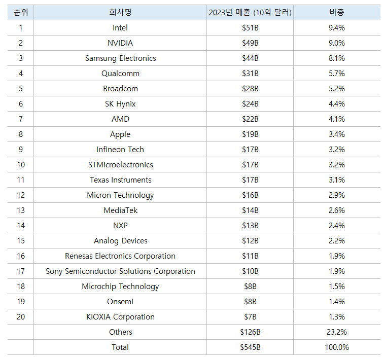 2024년 반도체 기업 매출 순위는 다음과 같습니다: