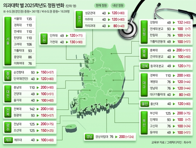 1. 비수도권 중심의 증원 : 총 증원분의 82%인 1639명이 비수도권 대학에 배정되어, 전국 의대 정원 중 비수도권이 차지하는 비율이 72.4%로 상승합니다. 말그대로 지방의료시대의 개막인 셈입니다.