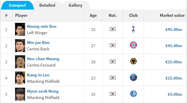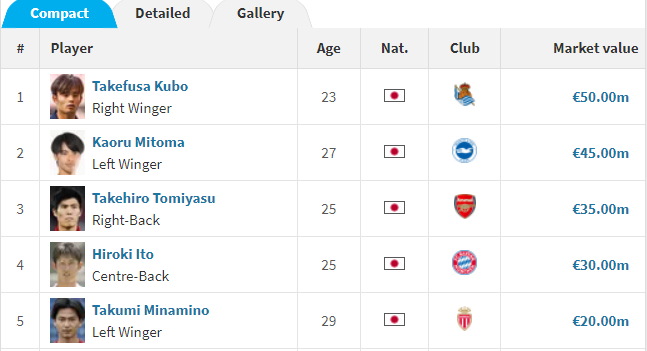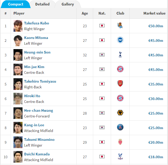 상위 20명 중 일본 국적의 선수가 무려 13명으로 생각보다 많아 놀라웠습니다.(한국은 4명) 근 10년 전부터 명실상부 아시아 최강 전력을 구축해 온 일본 국가대표가 실상 몸값 까지도 가장 높은 것은 어찌 보면 당연한 귀결입니다.