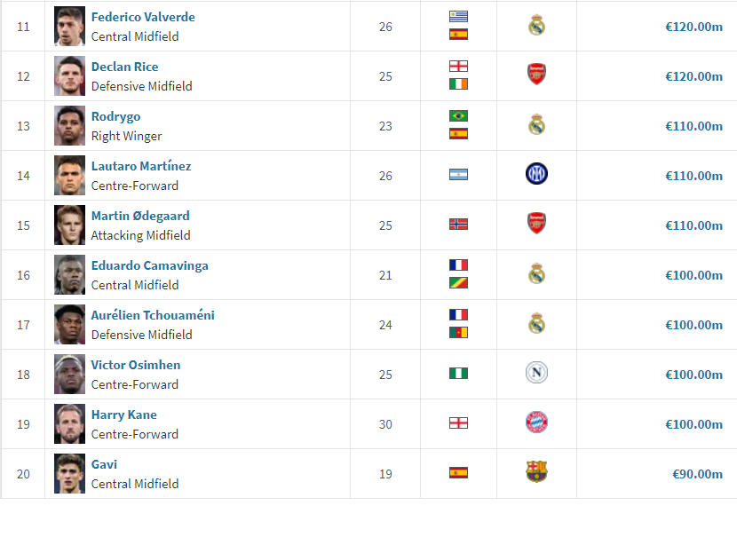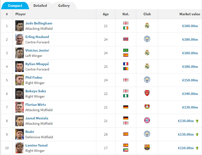 6위는 잉글랜드의 왼발 공격수 부카요 사카, 7위는 독일의 신성이자 천재 미드필더로 불리는 플로리안 비르츠, 8위는 독일(잉글랜드 이중국적)과 바이에른 뮌헨의 신성 자말 무시알라, 9위는 맨체스터 시티와 스페인의 핵심 자원이며 이번 유로 2024에서 스페인을 우승으로 이끈 캡틴 로드리, 10위는 역시 스페인의 신성이자 메시의 계보를 이을 축구 에이스 라민 야말입니다. 10위까지의 선수는 모두 1억 2천만 유로가 넘는 선수 몸값을 자랑합니다.