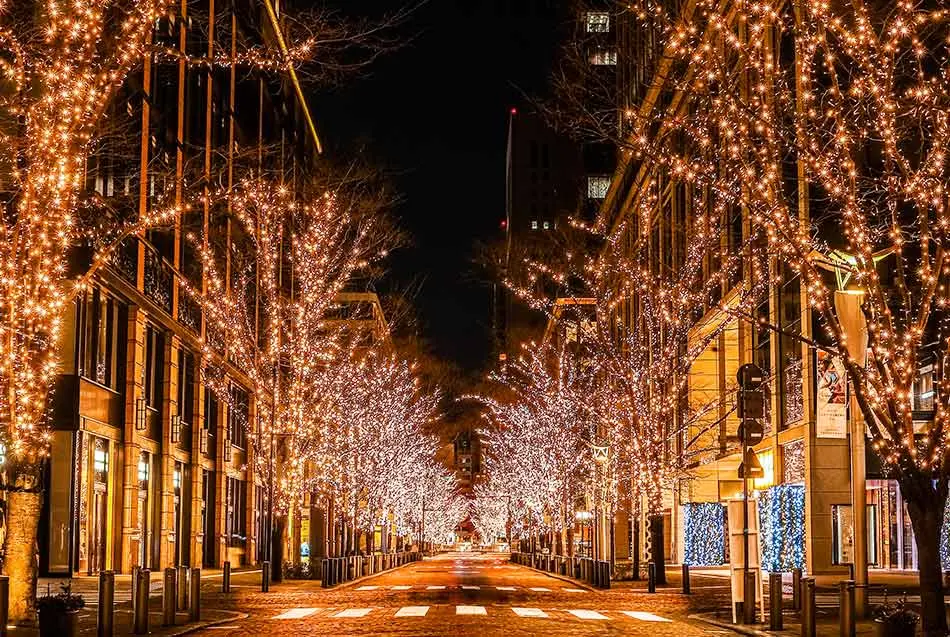 • 소라미자카와 스카이 아레나 주변에 눈부신 조명들이 가득하여 연말 분위기를 만끽할 수 있습니다.