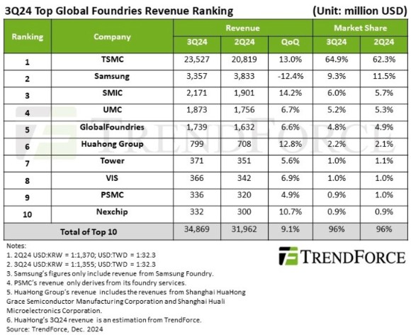 2024년 3분기 글로벌 상위 10대 파운드리 기업들의 총매출은 약 348억 6,900만 달러 수준으로 전 분기 대비 약 9.1% 증가하였습니다(2분기 총매출: 약 319억 6,200만 달러). 이는 파운드리 전반의 수요 반등과 AI, HPC(고성능컴퓨팅), 5G, 스마트폰 신작 수요 등으로 인해 첨단노드 생산 확대와 성숙공정 수요 안정이 혼합된 결과로 볼 수 있습니다.