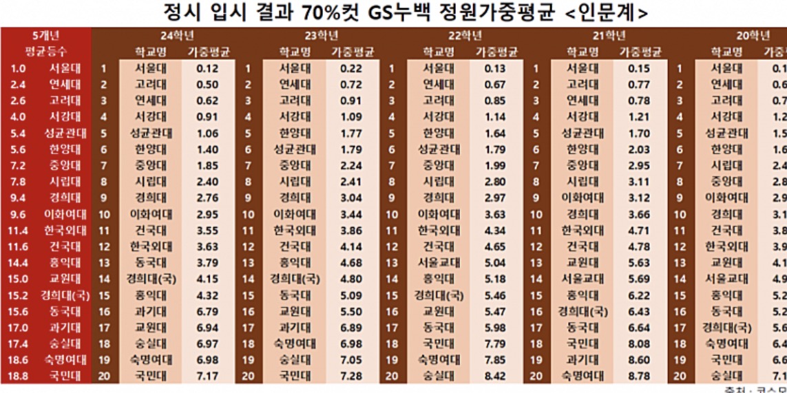 以下是由拥有多年经验和高度成熟的“入结”测量技术的入学考试专家们评估的大学序列,分为人文系列和自然系列。 (排除了难以横向比较“正试”入结的医学院、牙科学院、韩医学院、药学院等专业系列,以及KAIST、浦项工大、四大科学院、KENTECH等理工科特色大学,还有农协大学、航空大学等特殊目的大学。)