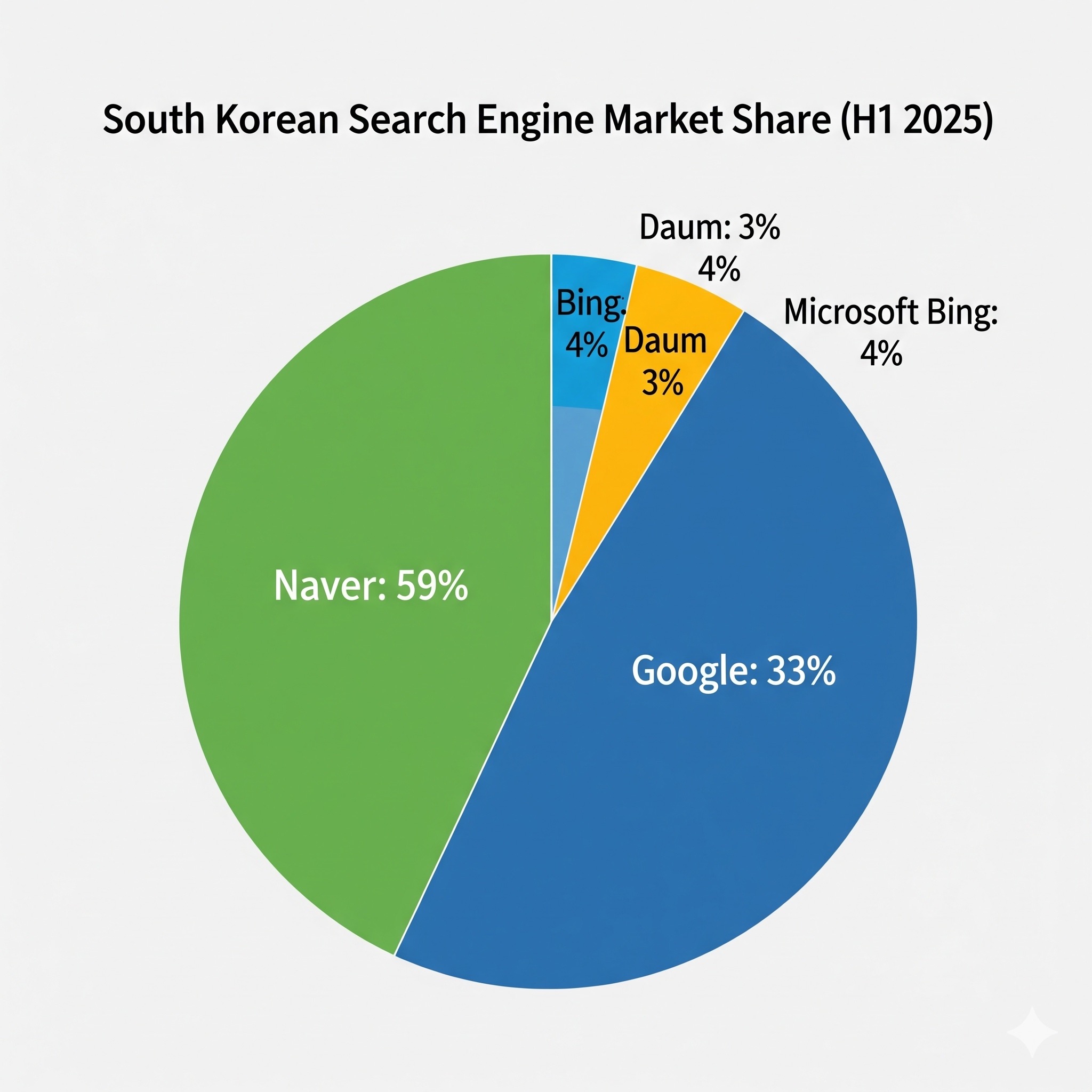 • 주요 검색엔진 점유율 (2025년 상반기 기준): 네이버 약 59%, 구글 약 33%, 마이크로소프트 Bing 약 4%, 다음 약 3% 수준으로 파악됩니다 . 기타 줌(ZUM) 등의 검색엔진은 1% 미만의 미미한 점유율을 보였습니다. 네이버가 여전히 1위를 유지하나, 구글과의 격차는 예년보다 크게 좁혀졌습니다.