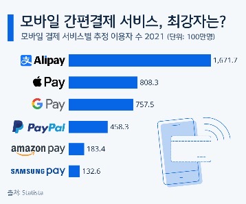 알리페이 (Alipay) 중국 중심 (아시아 일부 지역 확대) 약 13억 명 (2023년 기준)  QR코드 결제, 앱 내 결제, 전자상거래 연계 (슈퍼앱 기능)