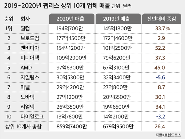 2025년 기준, 팹리스 매출 TOP 10 기업과 각 기업의 특징을 소개합니다.