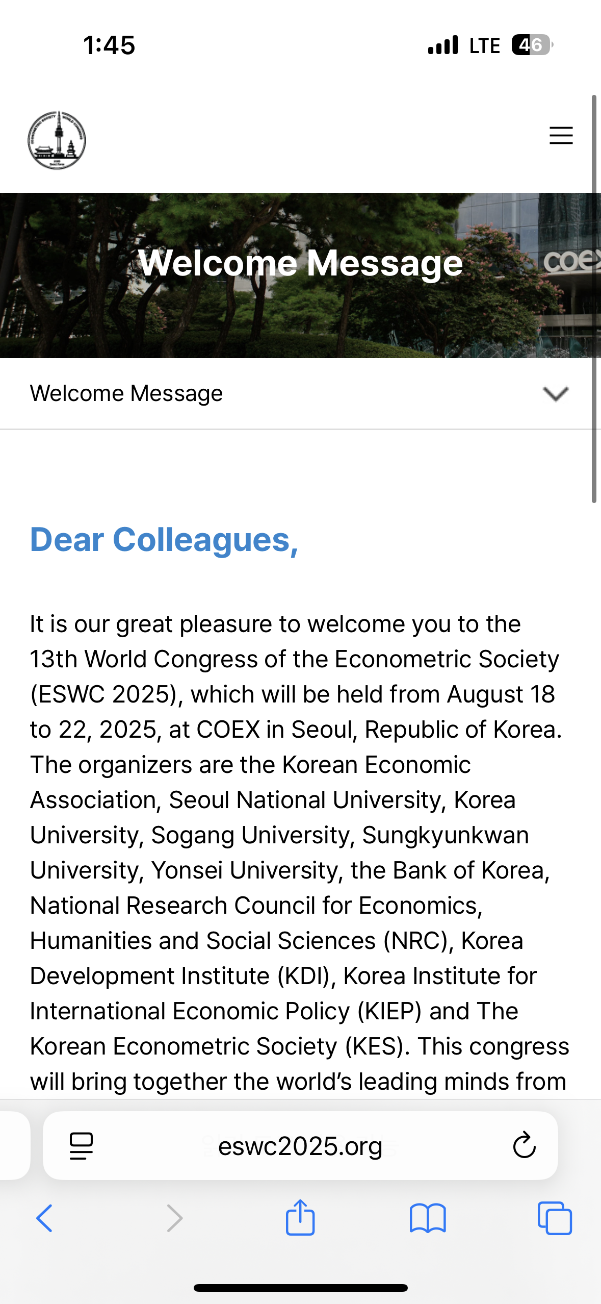 ESWC 2025 서울 대회 규모는 역대급으로 예상된다. 공식 등록 기준으로 세계 62개국에서 온 약 2,500여 명의 경제학자가 학술 프로그램에 참가하며 , 일반 청중과 동반 가족 등을 포함하면 총 1만 명 이상이 서울을 찾을 것으로 전망된다 . 이번 대회에서는 약 1,800편 이상의 논문이 5일간 발표되며 , 수백 개에 달하는 병렬 세션(Contributed Sessions)이 진행되어 경제학 전 분야의 최신 연구 성과가 공유될 예정이다.