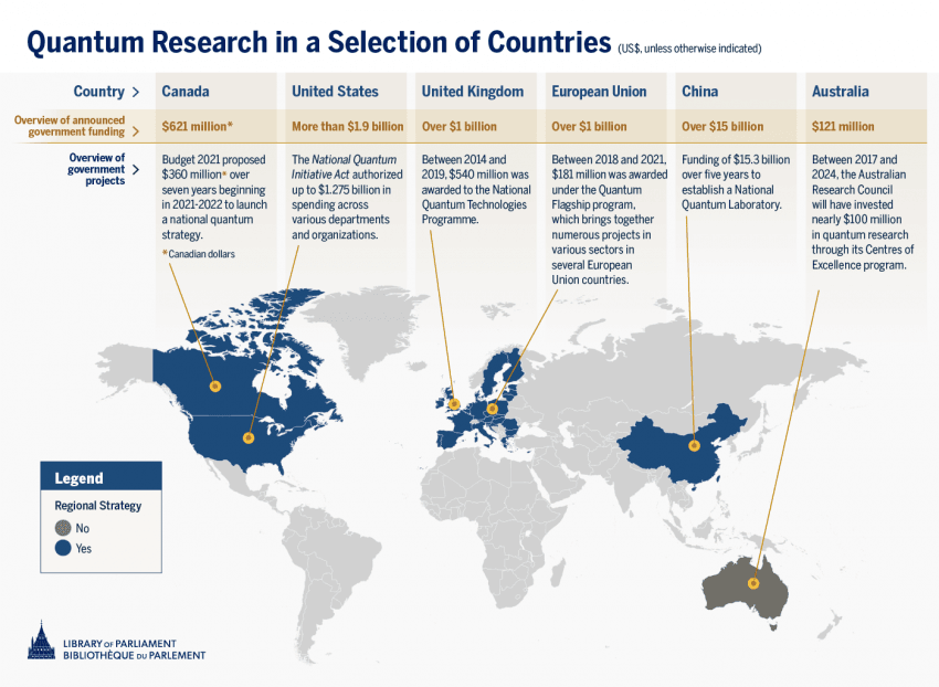 중국은 정부 주도로 가장 많은 양자 연구비를 투입하고 있으며, 양자 통신과 암호화 기술 분야에서 이미 세계 선두입니다. 2030년까지 세계 최초의 완전한 양자 인터넷 구축을 목표로 하고 있습니다.