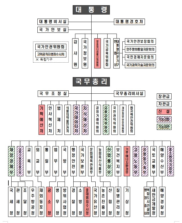 정부는 정부조직 개편방안을 오늘 발표합니다. 새 정부 출범 이후 약 3개월 만에 마련된 이번 개편안은 국민이 바라는 핵심 국정과제를 실천하고 국가 미래전략을 실행하기 위한 첫걸음입니다 . 무엇보다도 권한이 일부 부처에 과도하게 집중되는 폐해를 바로잡고, 국민이 체감할 수 있는 행정 효율성과 정책 집행력을 강화하는 데 개편의 방점을 두었습니다 .