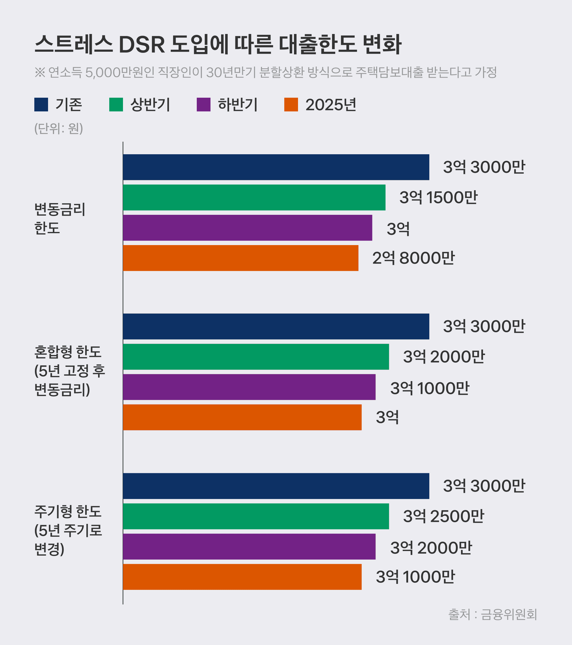 - 변경: 금리 상승 상황을 가정해 DSR 30~35%로 하향 조정 가능