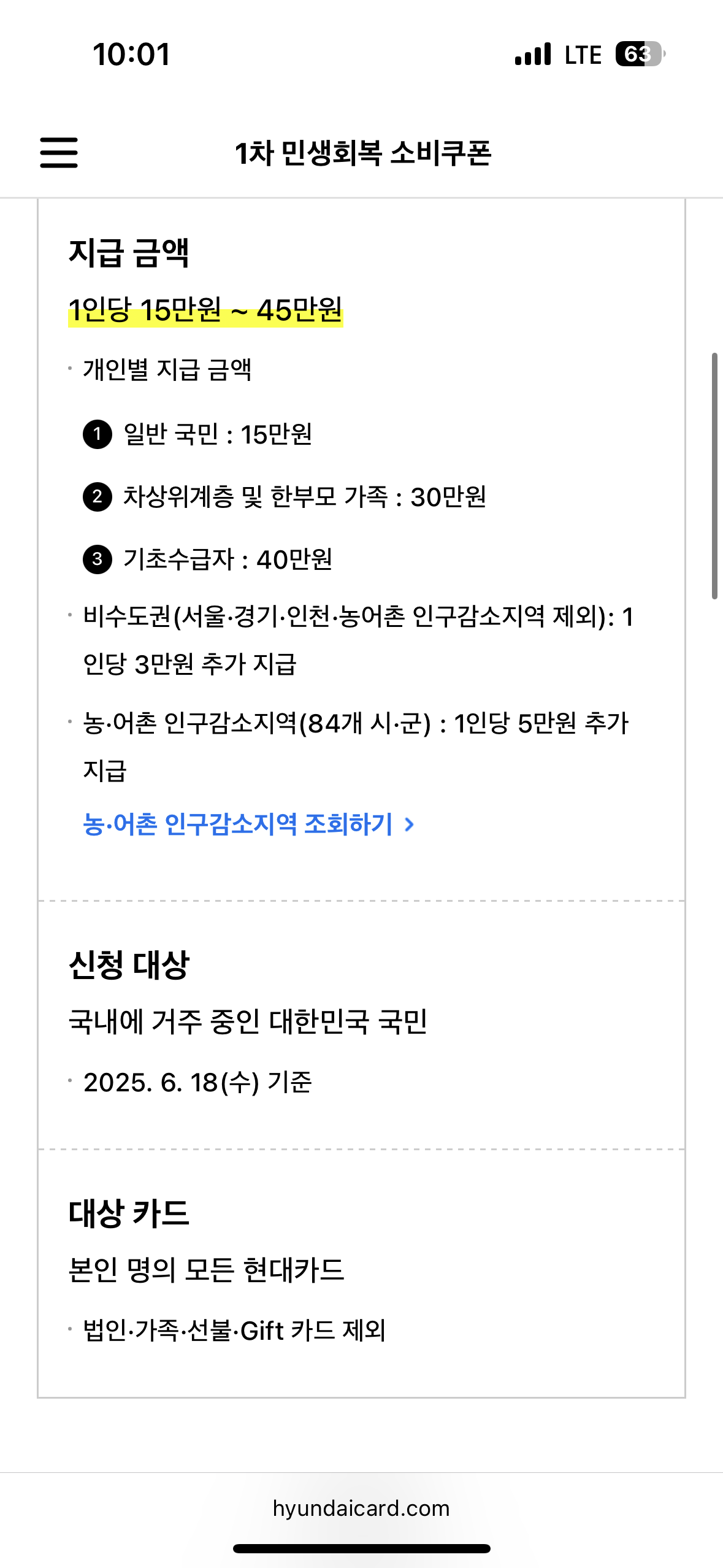 지역 추가 지급: 지역 균형 지원을 위해 비수도권 거주자에게 1인당 3만 원, 특히 인구감소지역으로 지정된 농어촌 지역 거주자에게는 5만 원의 금액이 1차 지급 시 추가로 지급됩니다 . 예를 들어, 기초생활수급자가 농어촌 인구감소지역에 주소를 둔 경우 1차에 40만 원 + 5만 원을 받아 총 45만 원이 충전되며, 2차 10만 원을 합쳐 최대 55만 원까지 수령 가능합니다  . 일반 국민도 수도권 밖 거주자는 18만 원(15+3) 또는 20만 원(15+5)을 1차에 받고 2차 포함 총 28만~30만 원을 받게 됩니다 . (비수도권: 수도권(서울·경기·인천)을 제외한 지역, 농어촌 인구감소지역: 행정안전부 지정 84개 시·군).