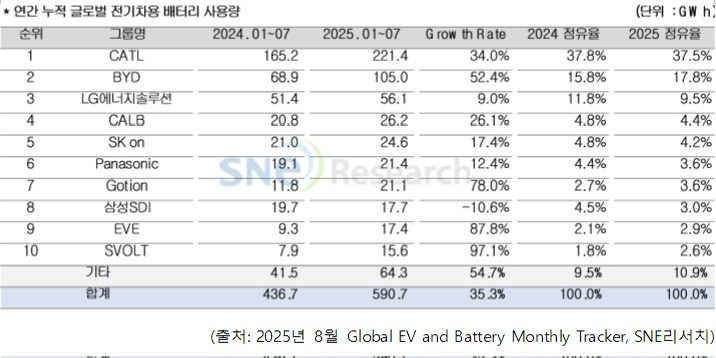 중국 배터리 제조사들의 약진은 2025년 상반기 시장의 가장 두드러진 특징입니다. 글로벌 상위 10위권 기업 중 6개가 중국 업체일 정도로, 중국 기업들은 내수를 넘어 세계 시장을 주도하고 있습니다 . 1~7월 누적 기준 세계 1위 CATL(닝더스다이)은 221.4GWh를 출하하여 37.5%의 압도적 점유율을 기록했고, 2위 BYD(비야디)는 105.0GWh로 17.8%를 차지하며 두 회사만으로도 절반 이상을 차지했습니다 . 3위 LG에너지솔루션(9.5%)을 제외하면 4위 CALB(중국, 4.4%), 5위 SK온(4.2%), 6위 파나소닉(일본, 3.6%), 7위 거션(Gotion, 중국), 8위 삼성SDI, 9위 EVE(중국), 10위 SVOLT(중국) 순으로 중국계 기업들이 상위권을 휩쓸었습니다  . 특히 CATL과 BYD는 전년 대비 각각 34%, 52% 이상의 높은 성장률을 보이며 세계 12위 자리를 더욱 공고히 했습니다 .