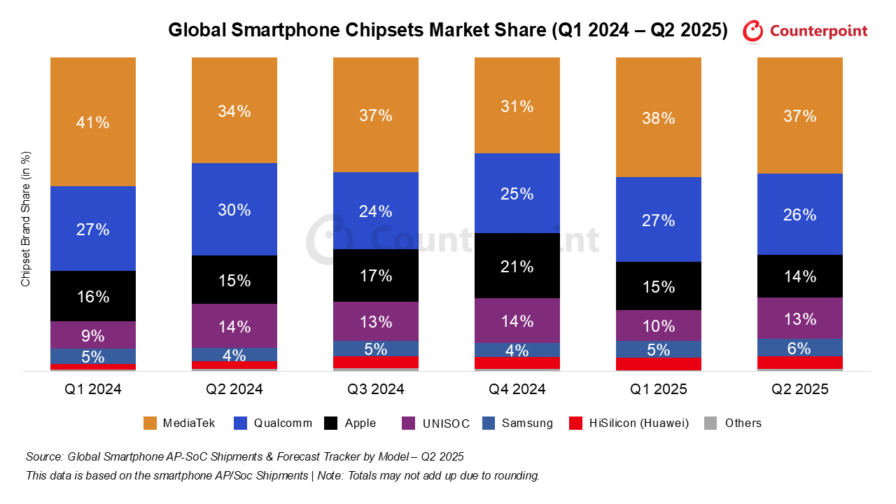 26%의 점유율로 2위를 기록했습니다 . 그러나 프리미엄 부문에서 스냅드래곤 8 엘리트 시리즈의 성장 둔화와 삼성 갤럭시 S24 시리즈의 수요 약세로 인해 2025년 2분기 전체 출하량은 전분기보다 감소했습니다. 반면, 신규 중급형 칩셋인 스냅드래곤 7 4세대와 기존 7 3세대 모델의 출하 증가로 스냅드래곤 700 시리즈 물량은 오히려 늘어났습니다 .