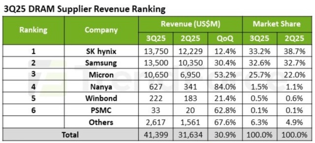 시장 동향: 2025년 3분기 글로벌 D램 시장 매출은 약 414억 달러로 전분기 대비 30.9% 증가했다 . D램 가격 상승과 출하량 확대가 매출 급증을 견인했다.