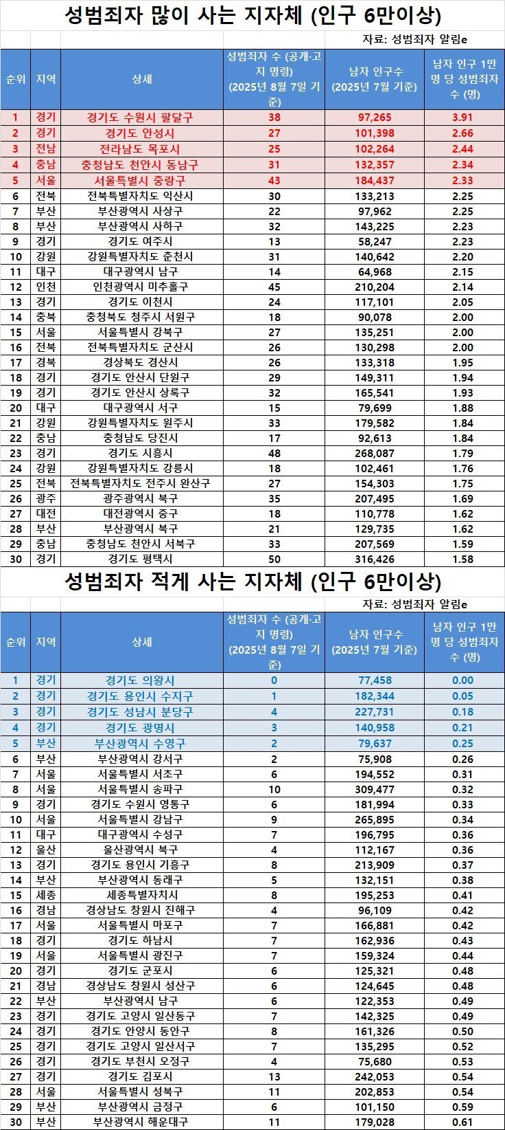 2025년 8월 7일 기준 공개된 성범죄자 알림e 자료에 따르면, 인구 6만 명 이상 지자체 중 성범죄자가 가장 많이 거주하는 상위 30개 지역의 1만 명당 성범죄자 수는 다음과 같습니다. (남성 인구 기준 1만 명당 인원) 상위권일수록 해당 지역에 거주하는 성범죄자 비율이 높음을 의미합니다.