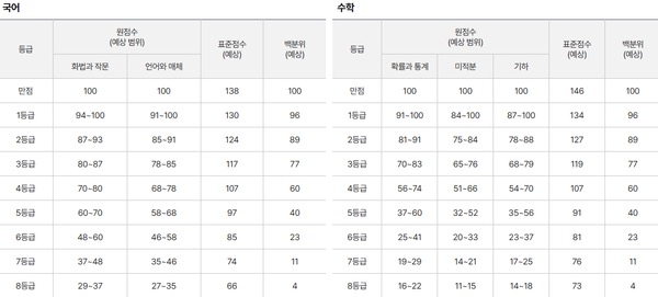 예상 표준점수 1등급컷