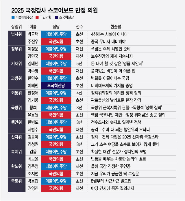 2025 국정감사에서 만점을 받은 의원들의 학력과 경력을 상세히 정리하였습니다.