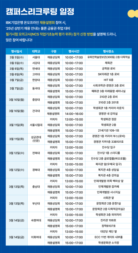 주요 대학을 직접 방문하여 채용 담당자가 전형 세부사항, 지원 팁, 직무 관련 질의응답 등을 진행합니다. 학교별 설명회 시간 및 장소는 각 대학의 취업지원센터 또는 IBK기업은행 채용 홈페이지 공지사항을 참고하시면 됩니다.